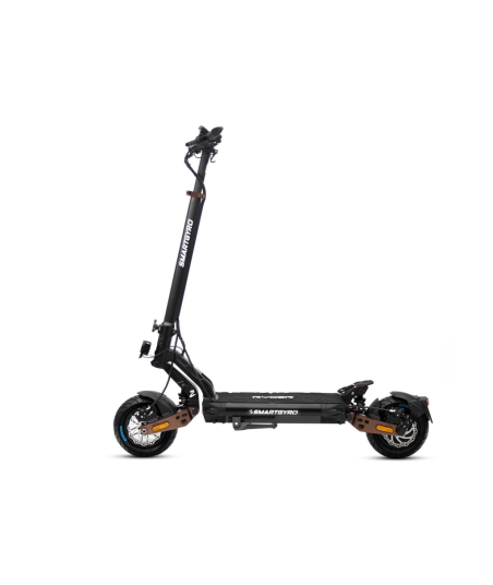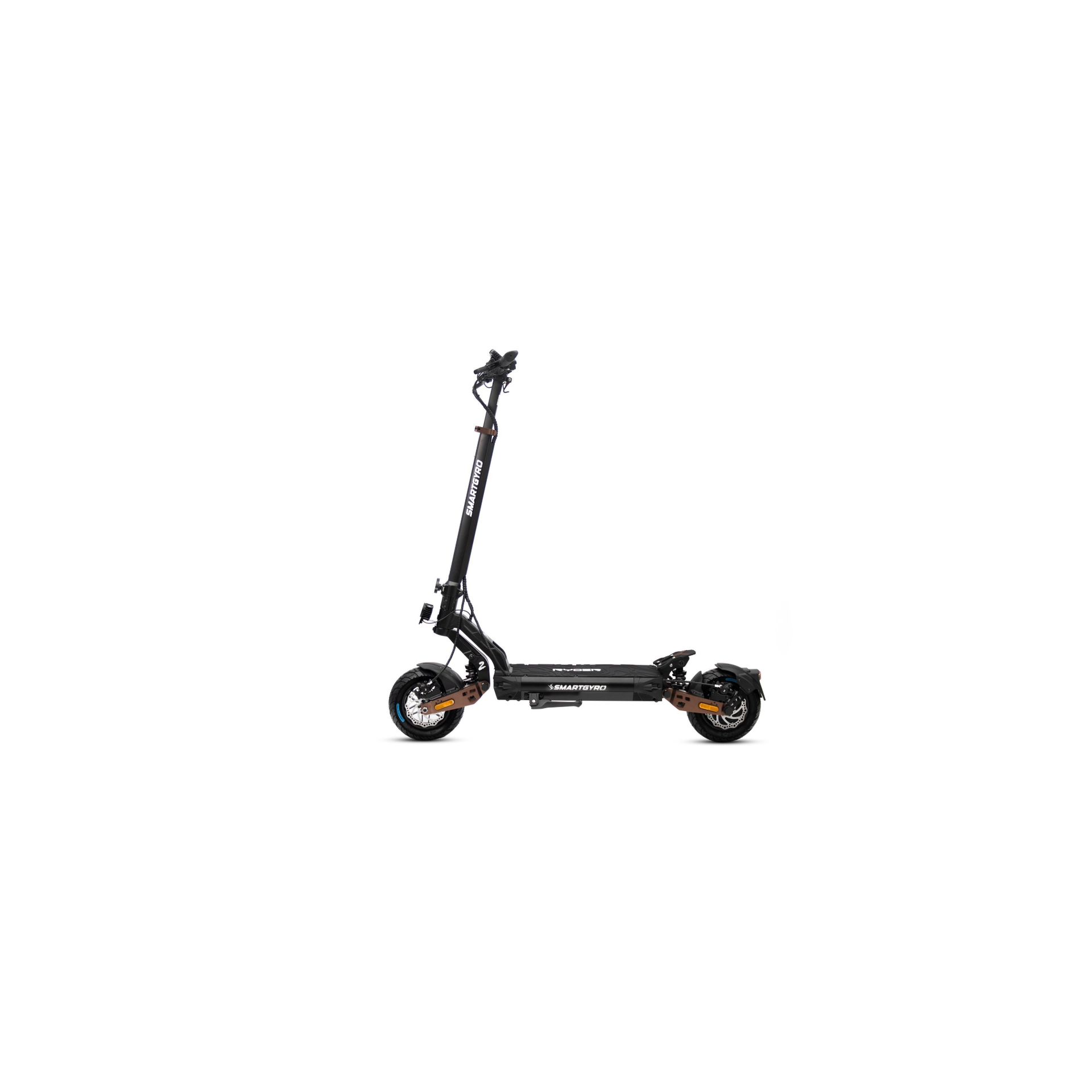 Patinete eléctrico certificado con una potencia máxima de 1000w 48V, batería de litio de 18.000 mAh con hasta 60 km de autonomía, ruedas de 10" neumáticas, frenos hidráulicos, suspensión delantera/trasera y triple frenada, App Smartgyro Neo.